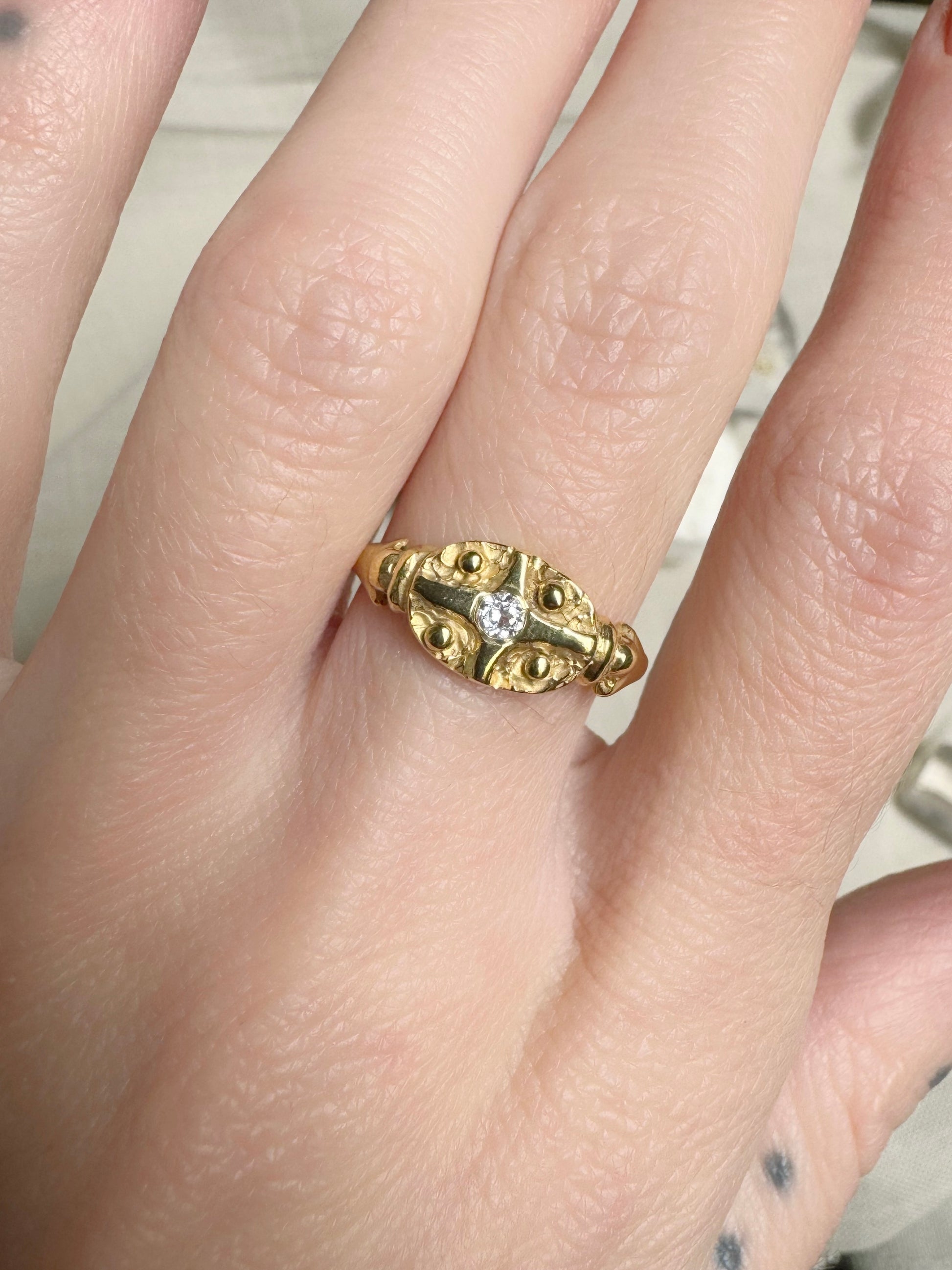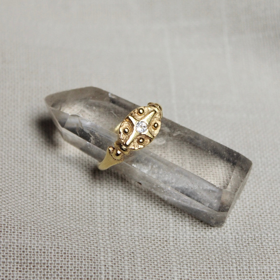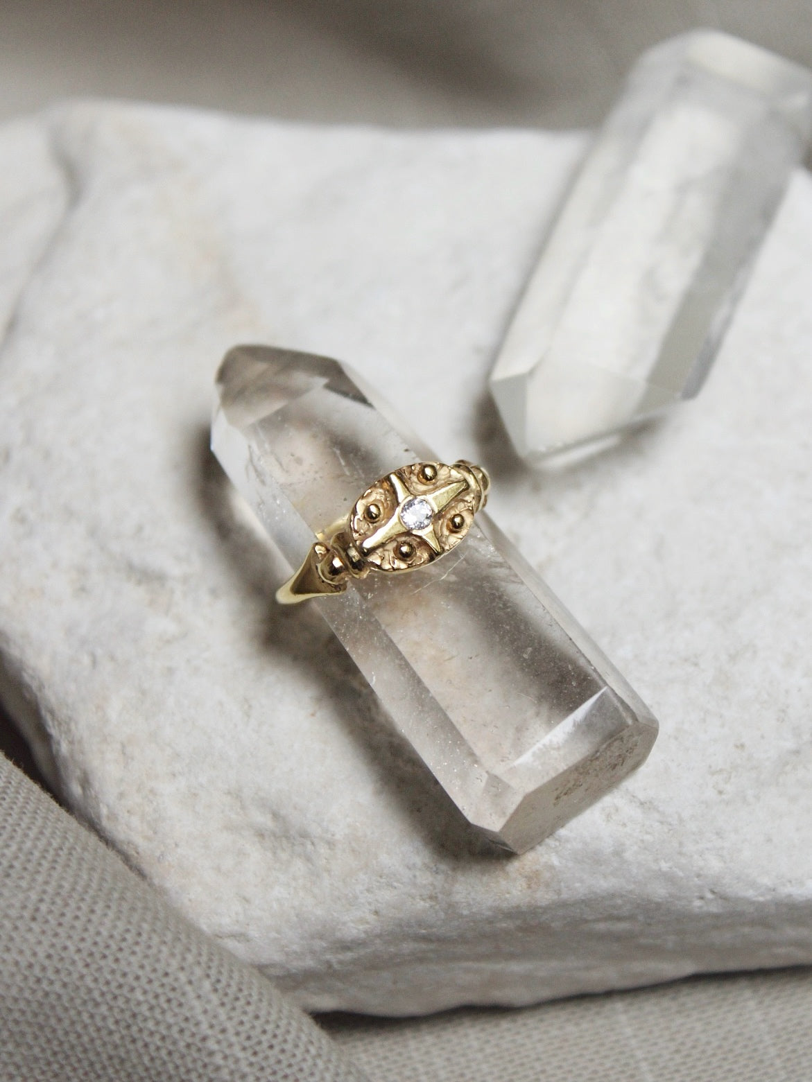 A gyűrű középpontjában az ASTRA ékszerek fő eleme az Esthajnalcsillag áll egy fehér topázzal kiegészülve. A szélein elhelyezkedő pöttyök a 4 Égtájat szimbolizálják. A gyűrűsínt egy korábbi ékszerem inspirálta.