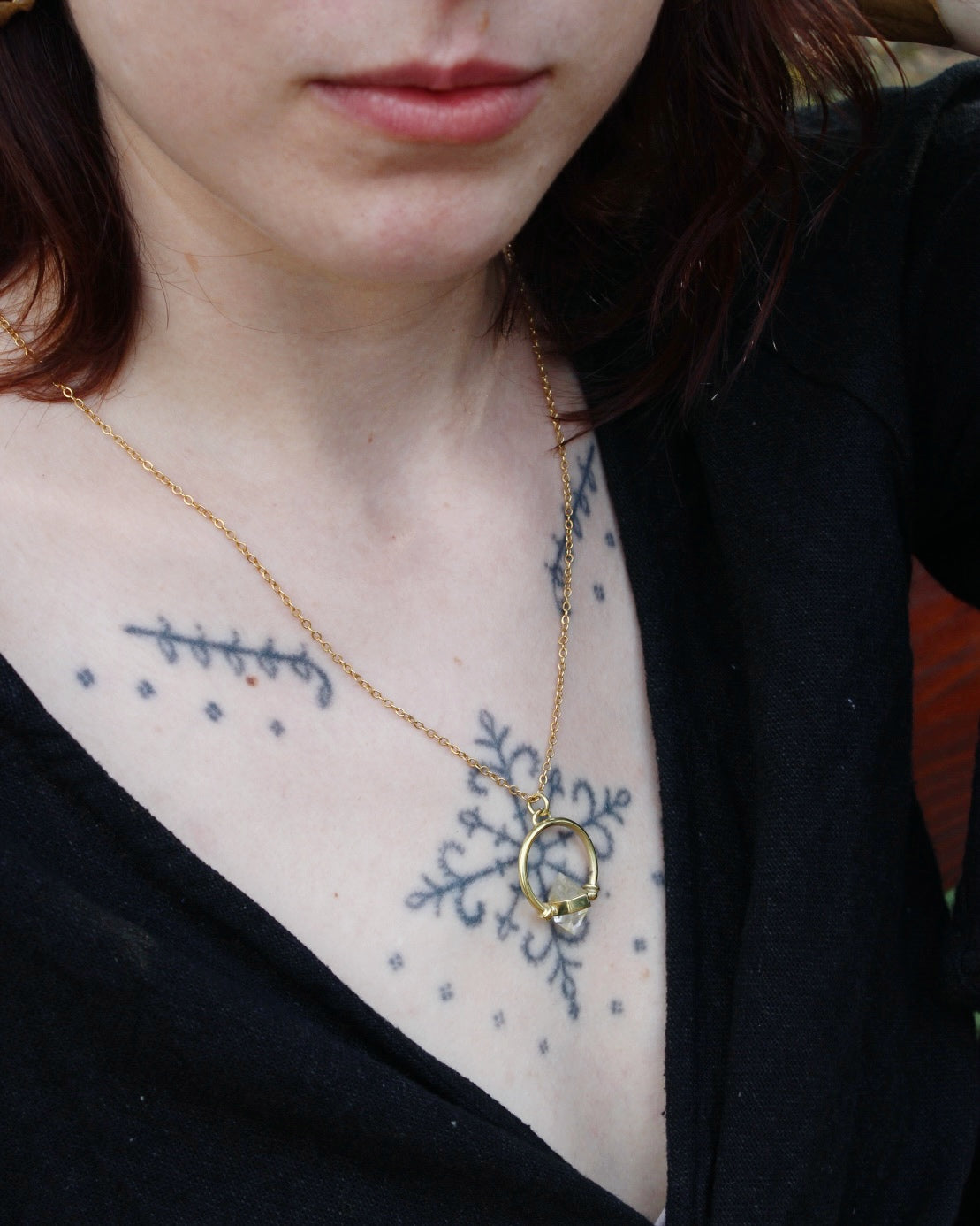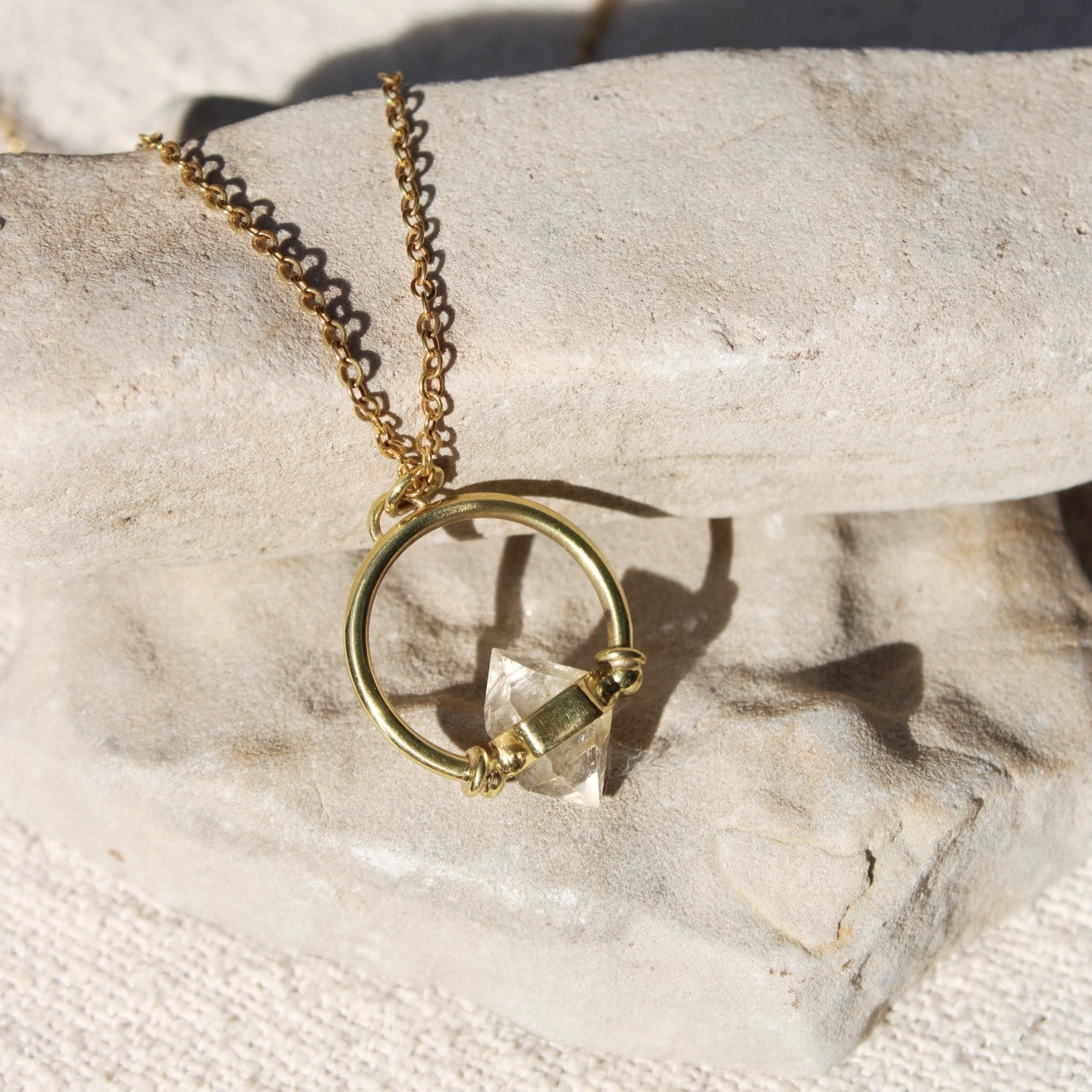 Ez az inspiráció jelenik meg ebben az alkotásban is, amelyet letisztultabb formában álmodtam meg. Az ékszer különlegességét a nyers Herkimer gyémánt adja, amit nemcsak kristálytiszta ragyogása teszi különlegessé, hanem az is, hogy a természet már önmagában tökéletes, csiszolás nélküli formában alkotta meg. Ez a különleges kvarckristály sokak szerint pozitív energiát hordoz, és rendkívüli tisztasága miatt spirituális jelentőséggel is bír.