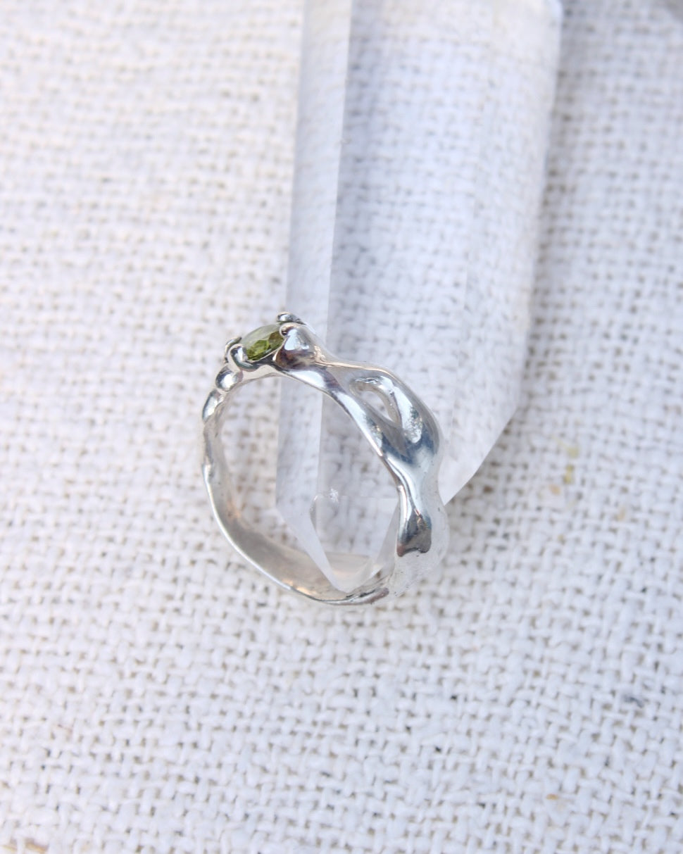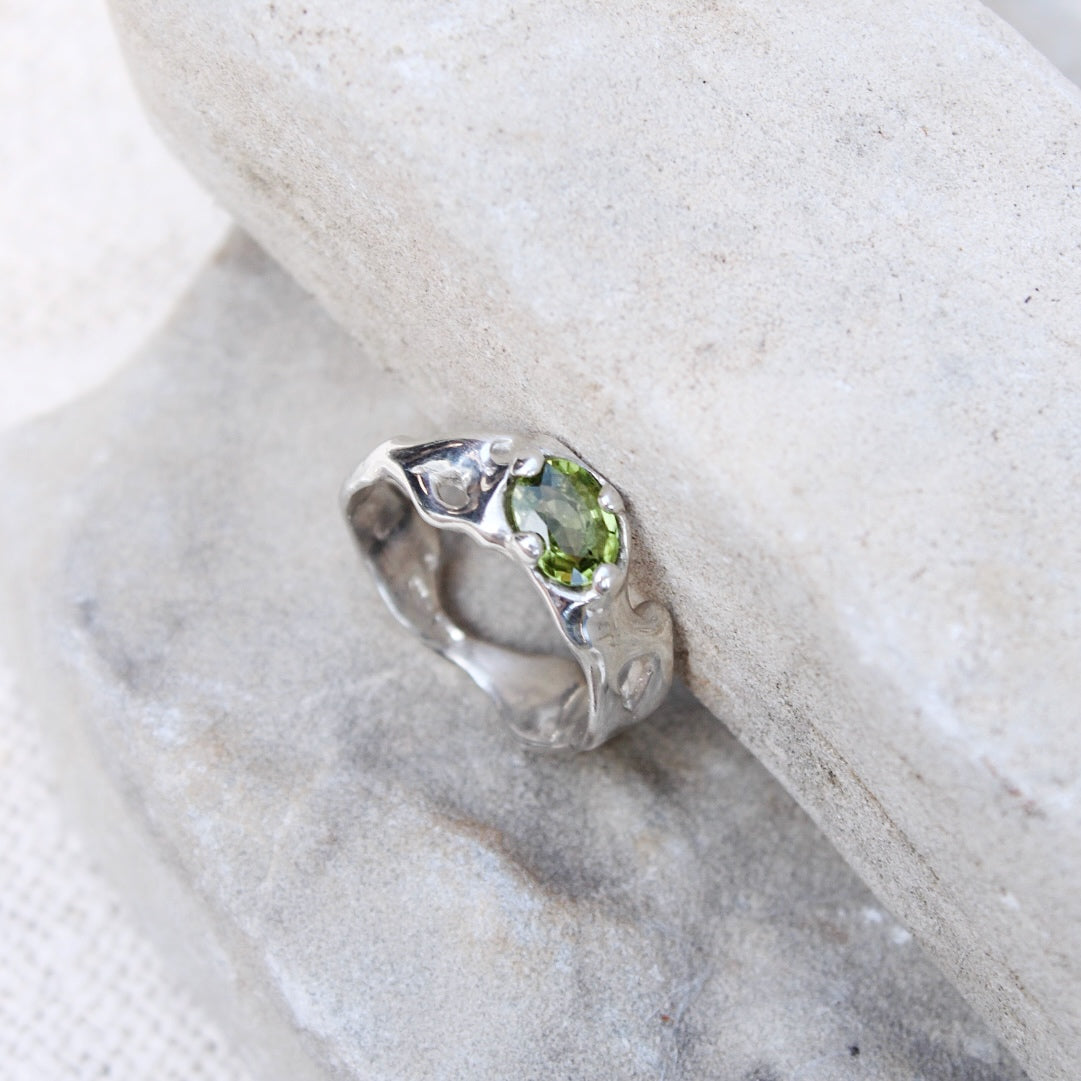 Ebben a gyűrűben a láva ősi ereje és a peridot zöld ragyogása találkozik.