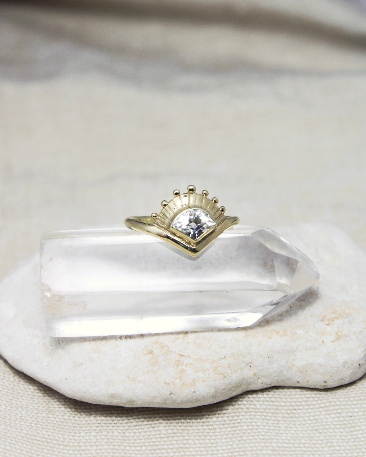 Az ékszer középpontjában egy különleges csiszolatú fazettált, fehér Topár foglal helyet. Légies, nőies darab azoknak, akik a finom részletekben találják meg a szépséget.